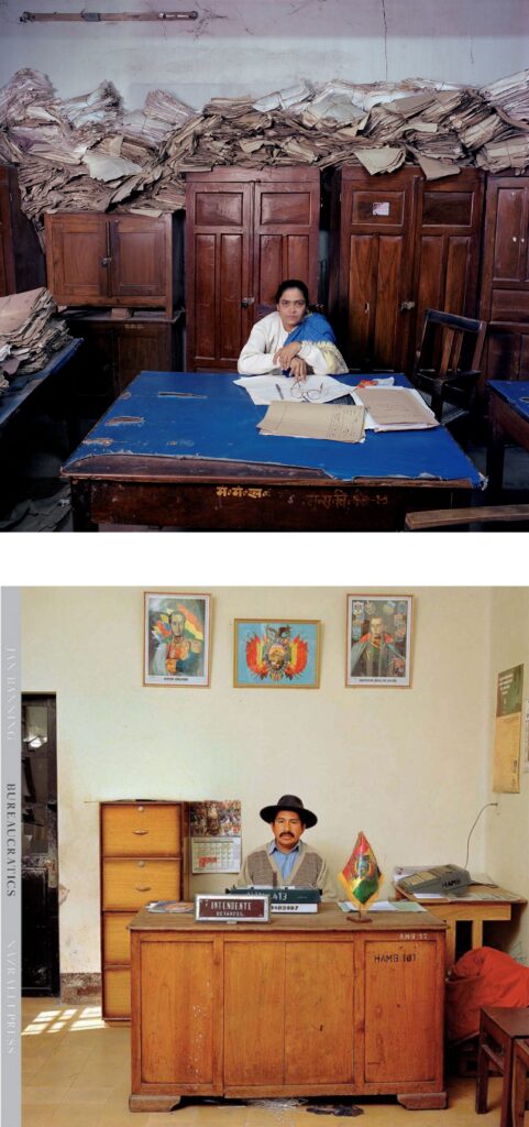 Bureaucratics is a comparative photographic study of the culture, rituals and symbols of state civil administrations and its servants in eight countries on five continents, selected on the basis of political, historical and cultural considerations: Bolivia, China, France, India, Liberia, Russia, the United States, and Yemen. In each country, Banning and the accompanying writer Will Tinnemans, visited hundreds of offices of members of the executive branch of government in different services and at different levels. Their visits were intentionally unannounced to keep the employees from tidying up or rearranging their workspaces.